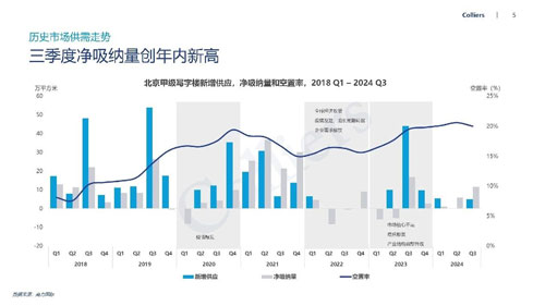 北京甲級寫字樓新增供應,凈吸納量和空置率,2018 Q1-2024 Q3