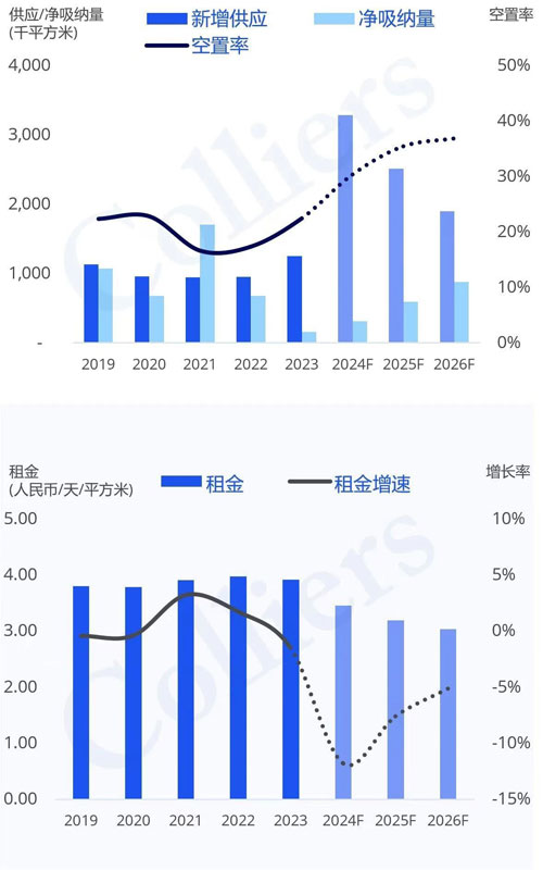 第三季度整體寫字樓市場仍然處于以價換量的市場環(huán)境,各級市場的租金水平持續(xù)下行,全市租金水平降至265.8元/㎡/月;整體空置率下降0.7%至