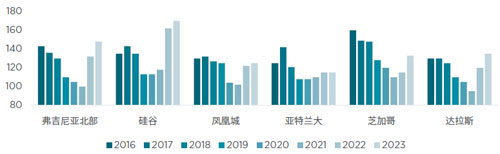北美重點(diǎn)城市數(shù)據(jù)中心平均服務(wù)費(fèi)單價(jià)(批發(fā)模式,250KW-4KW)單位:美元每月每KW