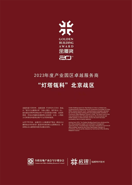 2023年12月28日-29日,中國寫字樓產業(yè)園發(fā)展論壇第二十屆年會在北京富力萬麗酒店舉辦。年會由北京市投資促進服務中心、北京商務中心區(qū)管理委員會、全聯(lián)房地產商會指導,全聯(lián)房地產商會寫字樓分會、首都會展(集團)有限公司、房訊網FUNXUN聯(lián)合主辦。尤為值得關注的是,2023第20屆“GOLDEN BUILDING AWARD金廈獎”評選結果在年會上正式揭曉,并舉行了盛大的頒獎典禮,表彰市場上涌現(xiàn)出來的優(yōu)秀企業(yè)、項目,對商業(yè)地產、產業(yè)園區(qū)的發(fā)展產生引領和示范效果。燈塔瓴科北京戰(zhàn)區(qū)斬獲“2023年度產業(yè)園區(qū)卓越服務商”,閃耀產業(yè)界內外。燈塔瓴科北京戰(zhàn)區(qū)憑借自身在產業(yè)創(chuàng)新方面的銳意進取,再次得到了業(yè)界的肯定和嘉獎。