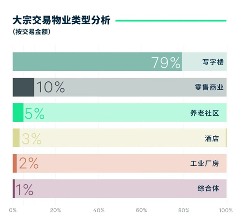 2023年,廣州投資市場錄得22宗成交,成交金額總計154.7億元,同比減少4.3%。成交資產(chǎn)類別涵蓋寫字樓、零售物業(yè)、酒店和廠房等,以成交金額計算,寫字樓的占比最高,達到79%。