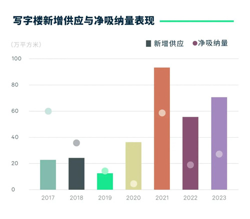 2023年,廣州寫字樓市場共錄得10個項目落成,總計70.7萬平方米,供應量同比增加28%。新增項目集中在琶洲和金融城,占全市體量80%以上。全市新項目落成時平均出租率為30%,比過往五年的均值40%有所下降。其中,業(yè)主自用以及關聯(lián)企業(yè)升級進駐總面積超過10萬平方米,帶動全市吸納量在年內(nèi)“低開穩(wěn)走”,至年末共計27萬平方米,同比增加41%,顯示市場需求有所恢復。