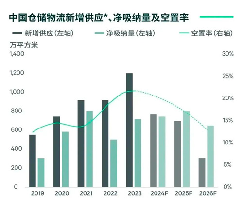 2023年倉(cāng)儲(chǔ)物流市場(chǎng)在跨境電商大舉擴(kuò)張下凈吸納錄得722萬(wàn)平方米,同比增長(zhǎng)44%,為僅次于2021年的第二高峰。新增供應(yīng)則達(dá)到了創(chuàng)紀(jì)錄的1,200萬(wàn)平方米,推升年底空置率至21.8%的歷史高位。