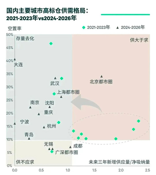 2024-2026年:縱軸為2023年末空置率,橫軸為期間新增供應(yīng)量/2021-2023年凈吸納量