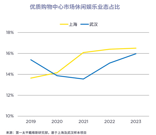 在商場數(shù)據(jù)中我們也能窺見一斑,購物中心內(nèi)休閑娛樂業(yè)態(tài)整體占比在2023年持續(xù)提升。在上海,休閑娛樂類業(yè)態(tài)占比由2019年的13.6%增長至16.5%。運(yùn)動健身、親子活動、影院劇場、酒吧演出等多個細(xì)分業(yè)態(tài)涌現(xiàn)新品牌或新內(nèi)容。此外,消費(fèi)者對向內(nèi)精神需求的追求和對文藝展覽類空間的品質(zhì)要求更高,文旅融合有望成為新興亮點(diǎn)。