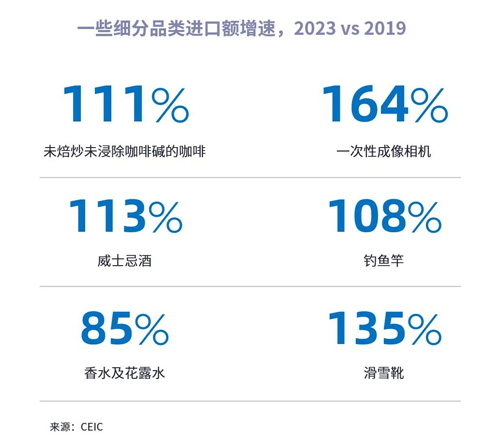 零售市場的大類及品牌豐富程度已今非昔比,一些新品類正成為增長亮點(diǎn)。從中國進(jìn)口產(chǎn)品增速來看,體育用品中的釣魚、滑雪;護(hù)膚美妝類中的香水;電子消費(fèi)品中的一次性成像相機(jī)不僅保持高速增長,相較疫情前更近乎或超過翻倍增長,是值得關(guān)注的潛力。而在食品類,咖啡及威士忌酒進(jìn)口額較疫情前2019年均增長超過100%。在餐飲類門店中,各類創(chuàng)意咖啡層出不窮,以年輕消費(fèi)者為主的小酒館已由街角走入購物中心。