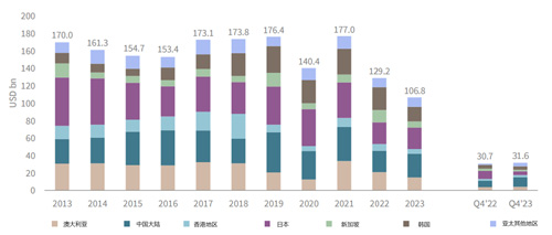 亞太區(qū)各主要市場2013-2023年商業(yè)地產(chǎn)投資額(單位:十億美元)