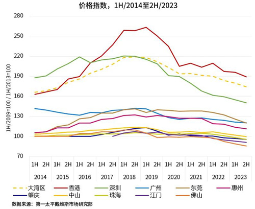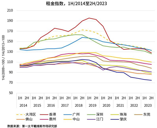 同期,由于經(jīng)濟(jì)形勢不確定性、美元利率上行等因素的共同影響,大灣區(qū)甲級寫字樓價(jià)格亦延續(xù)下降趨勢。