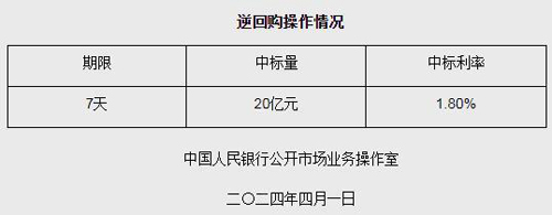 4月1日電 據(jù)中國人民銀行網(wǎng)站消息,為維護(hù)銀行體系流動性合理充裕,2024年4月1日人民銀行以利率招標(biāo)方式開展了20億元逆回購操作。