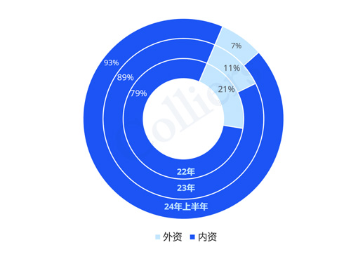 近三年外資投資活動不斷減少,2024年上半年,93%的資金來源是內(nèi)資機構(gòu)。