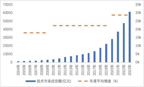 科技創(chuàng)新是推動發(fā)展的重要力量,并將成為未來中國經(jīng)濟發(fā)展的重中之重。作為技術(shù)創(chuàng)新和競爭力重要指標的中國技術(shù)市場成交額從2004年的1,334.36億元猛增到2023年的61,476億元,20年間增長了45倍,且年均增速從2010年前的17.9%增長至目前的28.7%。同時,《2023年全球人工智能創(chuàng)新指數(shù)報告》顯示,在全球人工智能發(fā)展上,中國的綜合水平保持了全球第二的水平,在人才培養(yǎng)和科研產(chǎn)出、產(chǎn)業(yè)發(fā)展等方面,近年來均取得了明顯的進展。此外,根據(jù)世界知識產(chǎn)權(quán)組織發(fā)布的《2023年全球創(chuàng)新指數(shù)》報告,在2023年全球創(chuàng)新指數(shù)排名中,中國的排名從2012年的34名上升至第12位,反映出中國在全球創(chuàng)新領(lǐng)域地位和影響力的大幅提升。
