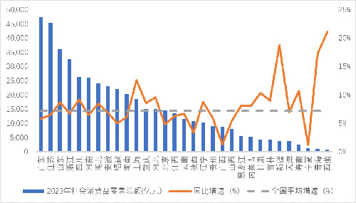 2023年各省(直轄市)社會消費品零售總額及同比增速