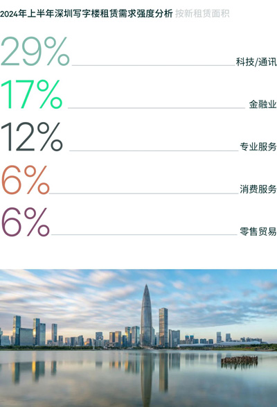 需求結(jié)構(gòu)方面,科技新賽道產(chǎn)業(yè)發(fā)展助推科技板塊重返需求榜首,金融需求則保持穩(wěn)定。二季度科技需求占比環(huán)比提升4.7個(gè)百分點(diǎn)至30.7%,主要分布在前海和高新園,主要貢獻(xiàn)自以人工智能、云計(jì)算及應(yīng)用、智能設(shè)備為主的軟件系統(tǒng)開發(fā)及頭部企業(yè)引領(lǐng)的跨境電商,金融業(yè)以17.4%的占比位列需求第二位。2024年上半年科技板塊同樣為第一大需求,占比為28.5%,錄得了數(shù)宗上萬(wàn)平方米的超大型租賃成交。金融排名需求第二位,占比為17.6%,傳統(tǒng)金融和其他金融服務(wù)各占半壁江山,其中傳統(tǒng)金融細(xì)分主要聚焦于保險(xiǎn)、基金和證劵細(xì)分板塊,而其他金融服務(wù)6成以上來自投資理財(cái)類企業(yè)。專業(yè)服務(wù)為第三大需求,主要來自法律和咨詢行業(yè),其中咨詢以企業(yè)管理類為主導(dǎo)。
