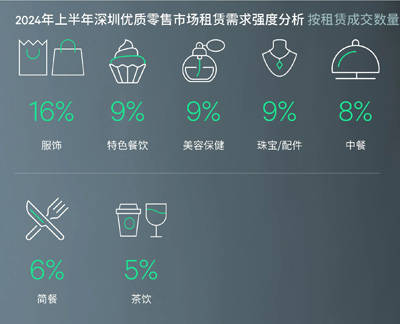 需求細(xì)分業(yè)態(tài)表現(xiàn)主要體現(xiàn)在以下幾個(gè)方面:首先,餐飲類需求熱度持續(xù)走高但內(nèi)部品牌迭代有所不同。上半年餐飲需求占比超4成,同比提升4個(gè)百分點(diǎn)。特色餐飲比重不斷加大,單品創(chuàng)新加快,除了傳統(tǒng)的椰子雞和酸菜魚以外,新加入啫啫煲。中餐需求較為穩(wěn)定,以潮汕菜和客家菜新開為主。茶飲和簡(jiǎn)餐的需求同比變化不大。但受制于經(jīng)濟(jì)放緩導(dǎo)致商務(wù)宴請(qǐng)的減少,高端餐飲及大餐飲經(jīng)營(yíng)表現(xiàn)不佳。其次,服飾和珠寶類需求相對(duì)穩(wěn)定,分別占比16.0%和9.0%,與去年同期相差無(wú)幾。服飾品牌的擴(kuò)張更多來自核心區(qū)域優(yōu)質(zhì)購(gòu)物中心主動(dòng)的租戶調(diào)整。一類為提升購(gòu)物中心競(jìng)爭(zhēng)差異度的國(guó)外首入品牌,一類為快速擴(kuò)張的連鎖品牌。法國(guó)服裝品牌American Vintage與日本優(yōu)衣庫(kù)姐妹品牌GU分別在萬(wàn)象天地和領(lǐng)展中心城開出了深圳首店。與此同時(shí),國(guó)內(nèi)一線品牌波司登和太平鳥亦在季內(nèi)錄得了多店齊開。此外,汽車品牌在購(gòu)物中心的拓店積極性明顯下降,同比下降1.5個(gè)百分點(diǎn),僅錄得5家店鋪新開。值得一提的是悅己經(jīng)濟(jì)帶動(dòng)美容健身類品牌活躍擴(kuò)張,類型涵蓋按摩、美容、美護(hù)發(fā)、美睫、采耳和健身,如絲域養(yǎng)發(fā)、洗臉貓等,此外香港健身品牌24/7fitness也于年初進(jìn)入深圳市場(chǎng)。
