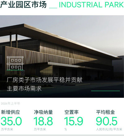 受經(jīng)濟(jì)放緩導(dǎo)致的需求收縮影響,整體市場(chǎng)平均租金半年度下降1.1%至每月每平方米90.5元。不同類型子市場(chǎng)租金表現(xiàn)分化,廠房類園區(qū)租金保持平穩(wěn)在每月每平方米45.4元,半年度無(wú)變化。研發(fā)辦公園子市場(chǎng)受需求波動(dòng)影響,租金半年度下降0.5個(gè)百分點(diǎn)至每月每平方米72.2元。而工業(yè)寫字樓市場(chǎng)因業(yè)主以價(jià)換量策略的持續(xù),平均租金半年度下降1.8%至每月每平方米140.3元。