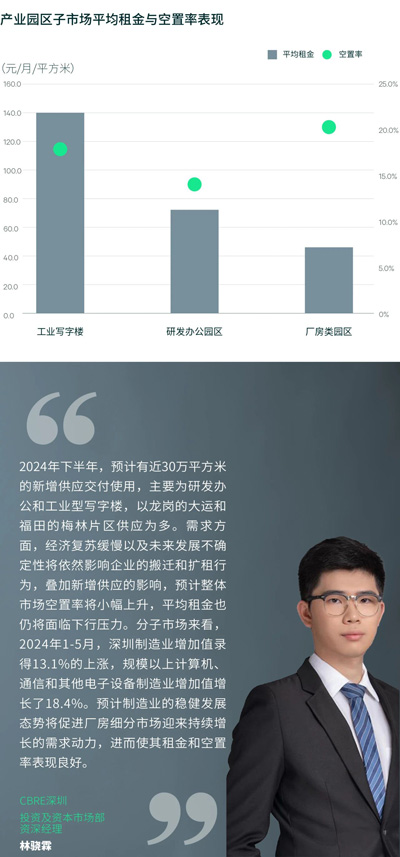 2024年第二季度共錄得三個(gè)項(xiàng)目共計(jì)16萬(wàn)平方米的新增供應(yīng)入市,包括2個(gè)工業(yè)型寫字樓和1個(gè)廠房,新項(xiàng)目分別為位于蛇口、前海和觀瀾,單季吸納量?jī)H錄得6.2萬(wàn)平方米,環(huán)比走弱。但2024年上半年整體市場(chǎng)凈吸納量共計(jì)18.8萬(wàn)平方米,同比增長(zhǎng)171.7%,需求有所回升。整體市場(chǎng)空置率受新項(xiàng)目入市及個(gè)別項(xiàng)目的退租影響,半年度上升1.5個(gè)百分點(diǎn)至15.9%。