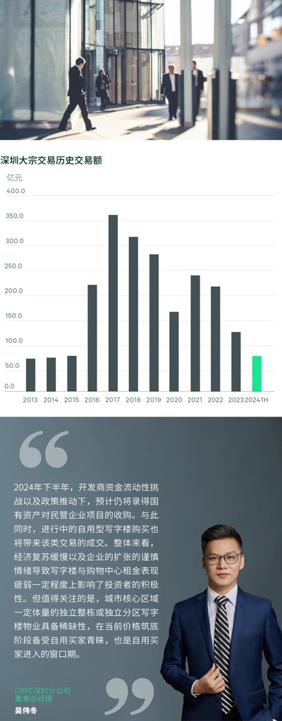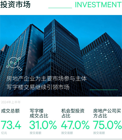 2024年二季度共錄得3宗成交,分別為一宗寫字樓、一宗工業(yè)和一宗購(gòu)物中心,成交總額為30.2億元,同比及環(huán)比均下跌3成左右。其中寫字樓貢獻(xiàn)了單季62.5%的成交額,為主要交易來源,且三宗交易均以資產(chǎn)交易的形式達(dá)成。2024年上半年總成交金額73.4億元,同比基本持平,寫字樓同樣以31%的交易額占比位居各類交易之首。上半年還罕見錄得一宗購(gòu)物中心的購(gòu)買,物業(yè)位于核心拓展區(qū)且經(jīng)營(yíng)收入穩(wěn)定增長(zhǎng),并采用了售后回租的交易方式。