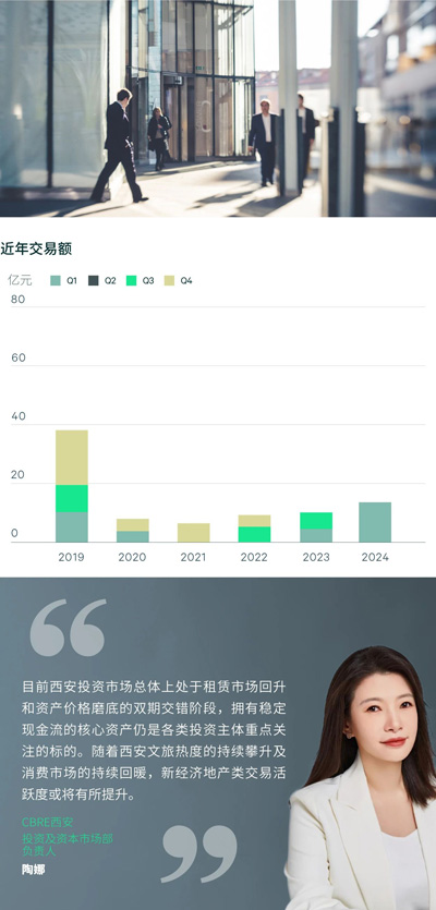 2024年上半年西安大宗交易市場(chǎng)共錄得3筆大宗成交,已知交易額達(dá)13.6億元。成交交易標(biāo)的為一宗酒店、一宗商業(yè)樓宇及一宗物流園項(xiàng)目,均為資產(chǎn)交易,市場(chǎng)交易標(biāo)的資產(chǎn)類型更趨多元。目前來(lái)看,“買方與賣方的預(yù)期差”仍是推進(jìn)大宗物業(yè)交易的難點(diǎn)之一,租賃和金融市場(chǎng)的不確定預(yù)期令投資者對(duì)資產(chǎn)價(jià)格的重新錨定尚存較大分歧。在物業(yè)收購(gòu)類型層面,雖寫字樓類型項(xiàng)目仍是占比最大的待售項(xiàng)目類型,受益于消費(fèi)場(chǎng)景和旅游出行的加速升溫,零售物業(yè)和酒店的關(guān)注度也持續(xù)走高,西安市場(chǎng)上此類型標(biāo)的數(shù)量也持續(xù)增加。分投資者類型來(lái)看,目前西安市場(chǎng)仍以個(gè)人買家最為活躍,同時(shí),政府下設(shè)平臺(tái)公司、城市更新基金等機(jī)構(gòu)的投資意愿持續(xù)上升。多元化的標(biāo)的類型及投資意愿的增加或?qū)⒐餐龠M(jìn)西安投資市場(chǎng)更趨活躍。