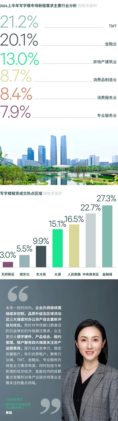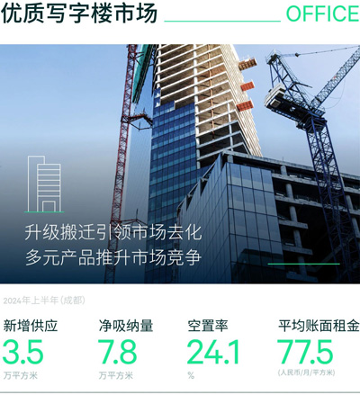 展望2024年下半年,成都優(yōu)質(zhì)寫字樓市場供應回升,約65萬平方米的樓宇預計交付,將推動總存量在年末突破千萬;其中,62.4%的供應將落于天府新區(qū),區(qū)域去化壓力將進一步加大。與此同時,順應辦公需求靈活、多樣的趨勢,第三方辦公服務商預計保持擴張態(tài)勢;存量樓宇也將繼續(xù)積極應變求進,通過改造空置房源以推出精裝、定制類產(chǎn)品。因此,下半年供應端不僅量升,亦將呈現(xiàn)更多元化的辦公產(chǎn)品,市場競爭或?qū)⒓觿 ?/P>