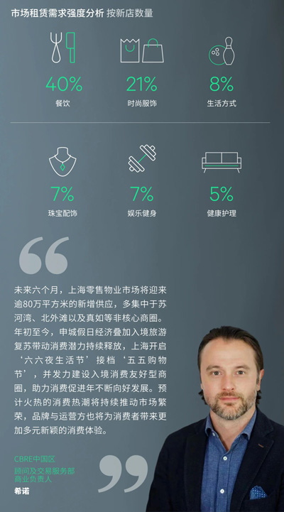 零售業(yè)態(tài)新租占比有所提升,其中服飾類需求占比21%,以戶外運(yùn)動(dòng)類品牌的活躍布局為引領(lǐng),潮流女裝品牌與潮流設(shè)計(jì)師品牌線下布點(diǎn)亦較為活躍,中國(guó)首家WTAPS落址上海新天地,芮歐百貨迎來(lái)KKRIZIA、American Vintage及ANINE BING等一系列品牌首店進(jìn)駐。此外,生活方式以及珠寶配飾品類需求亦較為顯著,分別占比8%和7%,配飾市集品牌amywrong阿米望全國(guó)首店在環(huán)球港開業(yè)。
