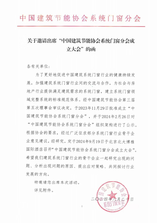 關(guān)于邀請(qǐng)出席“中國(guó)建筑節(jié)能協(xié)會(huì)系統(tǒng)門窗分會(huì)成立大會(huì)”的函