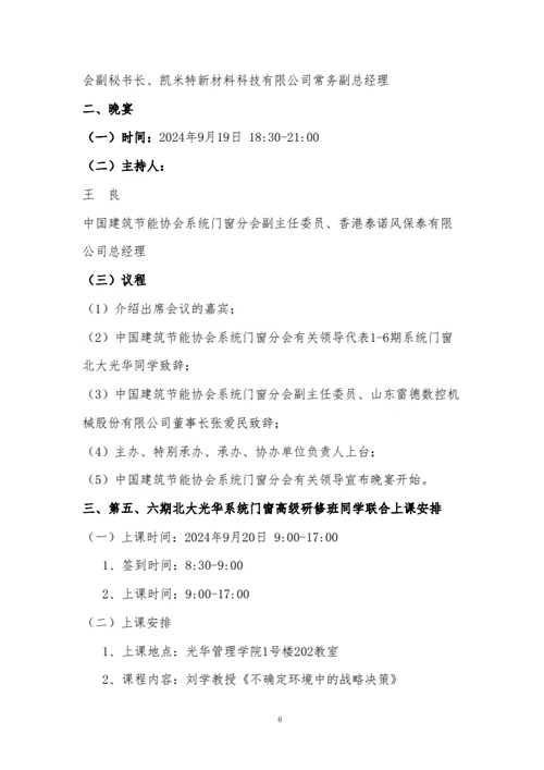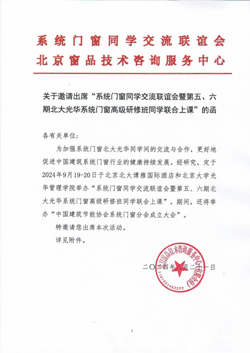 [提要]為加強系統門窗北大光華同學間的交流與合作,更好地促進中國建筑系統門窗行業(yè)的健康持續(xù)發(fā)展。經研究,定于2024年9月19-20日于北京北大博雅國際酒店和北京大學光華管理學院舉辦“系統門窗同學交流聯誼會暨第五、六期北大光華系統門窗高級研修班同學聯合上課”。