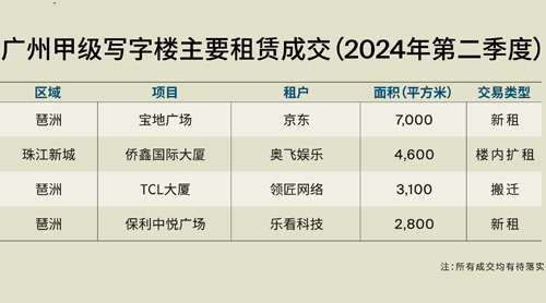 2024年第二季度,廣州寫字樓大宗交易市場略有升溫,錄得一宗成交,成交金額為人民幣2.16億元,標的為廣州海灝國際大廈的寫字樓單元。