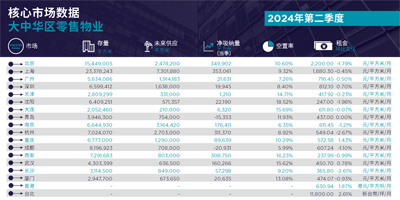 大中華區(qū)18個(gè)城市核心市場(chǎng)供應(yīng)/需求速覽(2024年二季度)