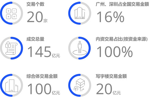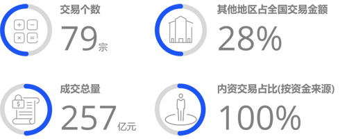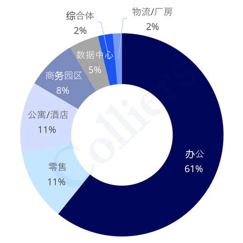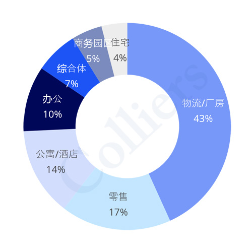 其次分別為物流/廠房、公寓/酒店、零售和商務園區(qū)等業(yè)態(tài),成交金額分別為124億元、113億元、108億元和68億元。