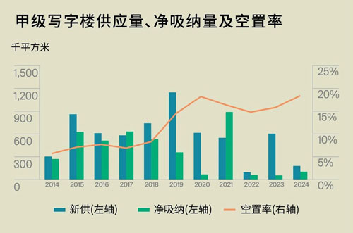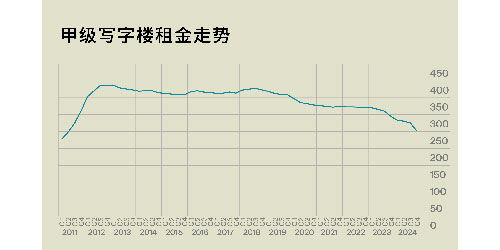 “盡管2024年搬遷需求較為旺盛,但新租需求明顯不足,加上租戶退租及縮租的情況較為普遍,平均空置率水平上升,租金下行。另一方面,由于企業(yè)持續(xù)的降本增效需求,部分甲級寫字樓租戶開始傾向于選擇乙級或更低級別的寫字樓,這也導(dǎo)致了甲級寫字樓市場的客戶流失。綜合以上因素,2024年第四季度全市甲級寫字樓的平均空置率繼續(xù)環(huán)比上漲0.8個百分點至18.4%!