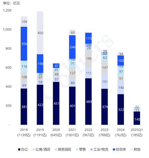 辦公物業(yè)2025年第一季度成交占比最大,主要為中郵保險109億收購博華廣場,這也是近三年唯一單筆超過100億的房地產(chǎn)大宗交易
