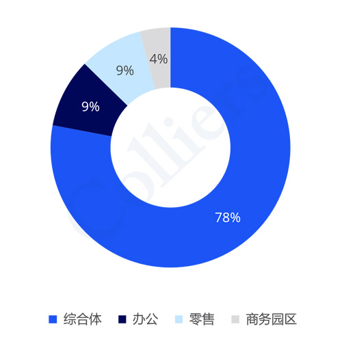 從交易金額看,綜合體交易占比最大,主要交易是興業(yè)銀行66億元買下深圳灣超級總部基地地塊項目