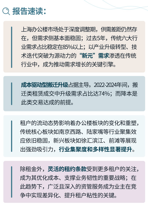 上海是中國經(jīng)濟(jì)發(fā)展的前沿地帶,其辦公樓市場的發(fā)展脈絡(luò)和格局變化與宏觀經(jīng)濟(jì)潮汐共振。仲量聯(lián)行最新發(fā)布的《2025上海辦公樓市場白皮書》以2022-2024年近1,200條租約數(shù)據(jù)為基礎(chǔ),甄別了近期市場需求的流動趨勢和辦公樓板塊的潛力機(jī)遇;并結(jié)合近百份租戶調(diào)研結(jié)果,描繪當(dāng)下選址策略全景圖,以期為行業(yè)各方指引航向,蓄勢而行。