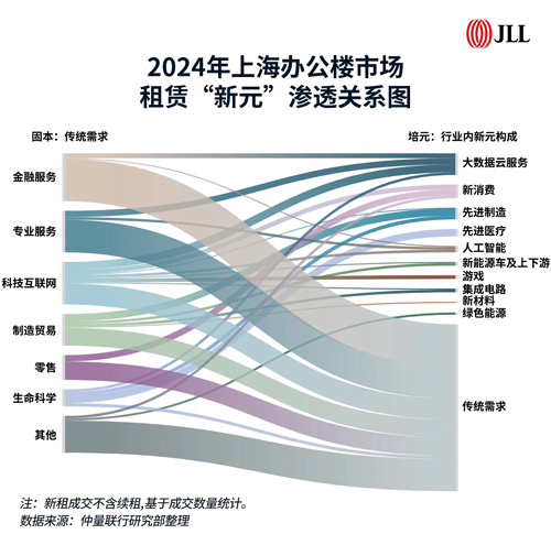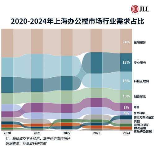 上海辦公樓市場傳統(tǒng)的六大行業(yè)需求包括:金融服務(wù)、專業(yè)服務(wù)、科技互聯(lián)網(wǎng)、制造貿(mào)易、零售和生命科學(xué),需求歷年占比均穩(wěn)定在全市85%以上,構(gòu)成多元且穩(wěn)固的基本面。2024年,這些行業(yè)在租金調(diào)整的環(huán)境下展現(xiàn)韌性,繼續(xù)支撐市場需求的基本框架。