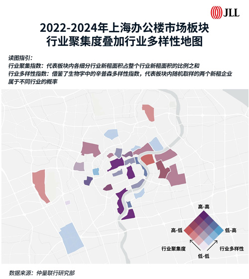 在租戶流動的背景下,上海辦公樓市場的板塊格局正快速重塑。仲量聯(lián)行深入分析了過去三年間各個板塊的成交數(shù)據(jù),并將行業(yè)聚集指數(shù)與行業(yè)多樣性指數(shù)兩項指標(biāo)結(jié)果進(jìn)行疊加呈現(xiàn),旨在更直觀地反映行業(yè)流向與板塊生態(tài)。