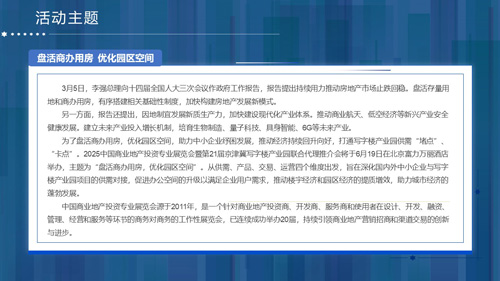 為了盤活商辦用房,優(yōu)化園區(qū)空間,助力中小企業(yè)紓困發(fā)展,推動(dòng)經(jīng)濟(jì)持續(xù)回升向好,打通寫字樓產(chǎn)業(yè)園供需“堵點(diǎn)”、“卡點(diǎn)”。2025中國(guó)商業(yè)地產(chǎn)投資專業(yè)展覽會(huì)暨第21屆京津冀寫字樓產(chǎn)業(yè)園聯(lián)合代理推介會(huì)將于6月19日在北京富力萬(wàn)麗酒店舉辦,主題為“盤活商辦用房,優(yōu)化園區(qū)空間”。從供需、產(chǎn)品、交易、運(yùn)營(yíng)四個(gè)維度出發(fā),旨在深化國(guó)內(nèi)外中小企業(yè)與寫字樓產(chǎn)業(yè)園項(xiàng)目的供需對(duì)接,促進(jìn)辦公空間的升級(jí)以滿足企業(yè)用戶需求,推動(dòng)樓宇經(jīng)濟(jì)和園區(qū)經(jīng)濟(jì)的提質(zhì)增效,助力城市經(jīng)濟(jì)的蓬勃發(fā)展。