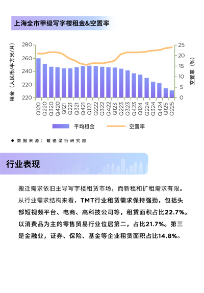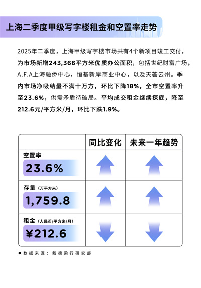 戴德梁行:上海二季度甲級寫字樓租金和空置率走勢