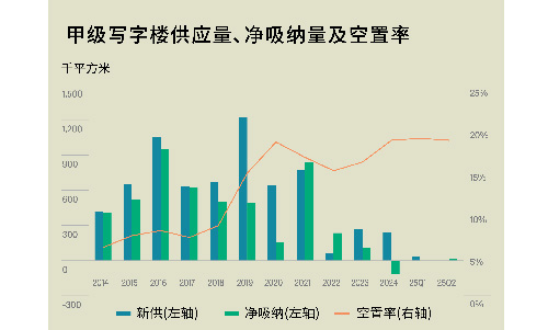 今年上半年,北京甲級寫字樓市場新增供應(yīng)有限,只有一個(gè)新項(xiàng)目竣工交付,即中海金融中心1號樓。原定將于第三季度竣工的齊家園外交辦公大樓(暫定名)項(xiàng)目(80,000平方米)推遲至2026年底竣工,因此我們預(yù)計(jì)2025年下半年北京甲級寫字樓市場無新項(xiàng)目竣工交付。在此背景下,截至二季度末,全市甲級寫字樓空置率環(huán)比下降0.2個(gè)百分點(diǎn)至18.4%,這一數(shù)值與2024年第四季度持平,成功扭轉(zhuǎn)了第一季度空置率上升的趨勢。同時(shí),凈吸納量由負(fù)轉(zhuǎn)正,錄得12,960平方米,反映市場需求有所回暖。
