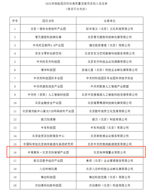 近日,北京市科學(xué)技術(shù)協(xié)會(huì)創(chuàng)新服務(wù)中心正式公布了"2025年賦能園區(qū)科協(xié)高質(zhì)量發(fā)展項(xiàng)目"擬入選名單,中南高科·北京農(nóng)科智城產(chǎn)業(yè)園憑借其卓越的產(chǎn)業(yè)定位、創(chuàng)新實(shí)力和發(fā)展?jié)摿,成功入選該項(xiàng)目擬支持單位名單,標(biāo)志著園區(qū)在推動(dòng)科技創(chuàng)新與科協(xié)高質(zhì)量發(fā)展方面獲得了政府高度肯定。