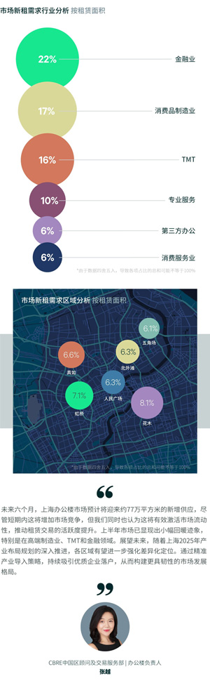 從行業(yè)需求來看,上半年金融業(yè)以22%的占比繼續(xù)領(lǐng)跑市場,主要受到基金和非銀金融機構(gòu)的推動;消費品制造業(yè)位居第二,占比17%,主要來自快消品和家居類企業(yè)的擴張需求;TMT位列第三,占比達(dá)16%,跨境電商和互聯(lián)網(wǎng)平臺公司的擴張成為其主要驅(qū)動力;專業(yè)服務(wù)業(yè)排名第四,占比10%,主要來自法律和傳媒類企業(yè)的搬遷擴張需求;此外,第三方辦公運營回歸前五,占比達(dá)6%,反映出在市場環(huán)境調(diào)整背景下,部分業(yè)主開始傾向合作運營模式以提升物業(yè)吸引力。