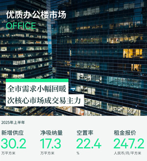 租金方面,上半年全市租金報價較去年年底下降3.0%至每月每平方米247.2元,有效租金下降4.3%至每月每平方米174.4元。各子市場均呈現(xiàn)出了不同程度的下滑。