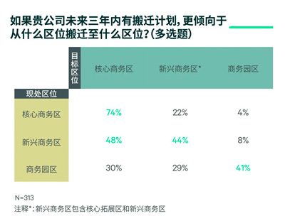 在今年調(diào)查中, 我們?cè)儐?wèn)了租戶當(dāng)前辦公所在和搬遷意向區(qū)位,從而更好地了解租戶對(duì)不同辦公區(qū)位的偏好。