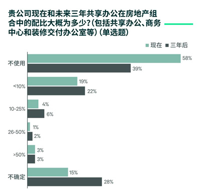 今年的調(diào)查結(jié)果顯示,企業(yè)租用共享辦公的傾向呈上升趨勢(shì):三年后考慮在企業(yè)房地產(chǎn)組合中納入共享辦公的受訪者占比為33%,較當(dāng)前使用共享辦公的企業(yè)占比上升6個(gè)百分點(diǎn)。CBRE認(rèn)為,在經(jīng)濟(jì)和業(yè)務(wù)前景尚不完全明朗的情況下,共享辦公是企業(yè)增強(qiáng)房地產(chǎn)規(guī)劃彈性、減少資本開(kāi)支的有效途徑之一,這一趨勢(shì)也與調(diào)查中受訪企業(yè)將“靈活的租約條款”作為重要選址因素的發(fā)現(xiàn)相吻合。但總體來(lái)看,共享辦公仍是企業(yè)房地產(chǎn)組合中的補(bǔ)充型選項(xiàng),僅有11%的受訪企業(yè)預(yù)計(jì)三年后共享辦公在其房地產(chǎn)組合中的配比超過(guò)10%。