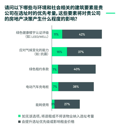 綠色選址考量重要性排名來(lái)看,綠色健康樓宇認(rèn)證和樓宇抗災(zāi)能力仍位列前二,被半數(shù)以上租戶認(rèn)為是關(guān)鍵性指標(biāo),綠色租約條款位列第三。