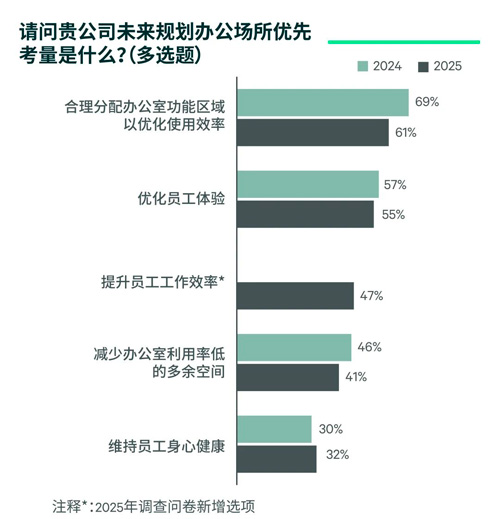 與2024年調(diào)查結(jié)果相比,租戶對(duì)空間調(diào)整的需求,即“合理分配辦公室功能區(qū)域”和“減少辦公室利用率低的多余空間”有所降低,我們認(rèn)為這與近年來(lái)租戶持續(xù)進(jìn)行空間布局優(yōu)化不無(wú)關(guān)系。
