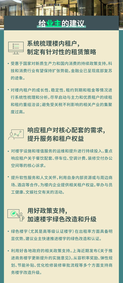 我們認(rèn)為可持續(xù)發(fā)展仍是企業(yè)房地產(chǎn)的中長(zhǎng)期趨勢(shì)。但值得注意的是,在已設(shè)定零碳目標(biāo)的租戶中,今年有1/5的企業(yè)表示考慮推遲或正在重新審視原定目標(biāo),這或與近期歐美地區(qū)清潔能源、新能源汽車等領(lǐng)域的相關(guān)政策變化,以及企業(yè)經(jīng)營(yíng)預(yù)期和戰(zhàn)略目標(biāo)的調(diào)整有關(guān)。