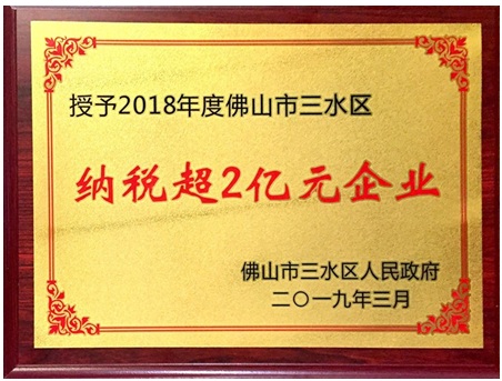 ▲歐神諾獲2018年度佛山市三水區(qū)納稅超2億元企業(yè)