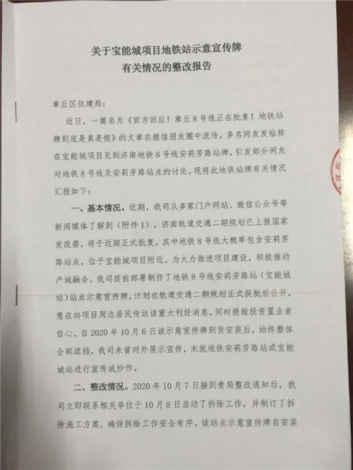 10月7日下午,濟(jì)南市章丘區(qū)住建局發(fā)現(xiàn)網(wǎng)絡(luò)相關(guān)信息后,第一時(shí)間責(zé)令寶能城項(xiàng)目進(jìn)行整改;