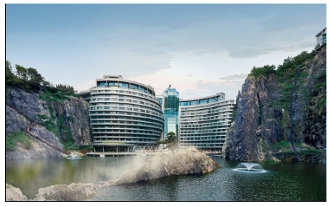 該酒店項目位于上海市松江佘山國家旅游度假區(qū)的天馬山深坑內(nèi),酒店依附深坑崖壁而建,是世界首個建造在廢石坑內(nèi)的自然生態(tài)酒店。該酒店項目海拔負(fù)88米,主體由地上、地下至水面及水下三部分組成,建筑格局為地上2 層、地平面下15層(其中水面以下兩層),客房設(shè)有觀景露臺,賓客可坐享其間欣賞峭壁瀑布美景。