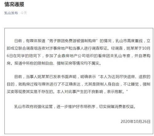 據微信號“乳山發(fā)布”26日通報,日前,有媒體報道“男子跟團免費游被強制購房”的情況,乳山市高度重視,立即成立聯合調查組連夜對涉事房地產和當事人進行調查取證。經調查,姚某某于10月6日在同學的陪同下,參加了金鼎房地產公司組織的看房團來乳山考察,并自愿購房。報道中所稱的限制自由、強制買房等情況均不屬實。